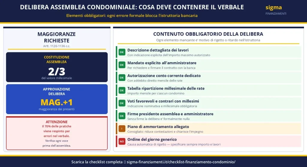 La delibera deve contenere obbligatoriamente: descrizione dettagliata dei lavori e importo massimo, mandato esplicito all’amministratore per richiedere e firmare il contratto, autorizzazione all’apertura del conto corrente dedicato, tabella di ripartizione millesimale delle rate, voti favorevoli e contrari con indicazione dei millesimi, firme del presidente dell’assemblea e dell’amministratore.