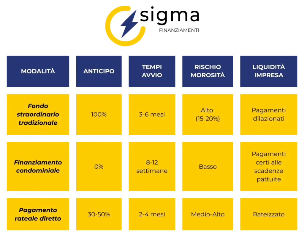 Con il finanziamento condominiale, i fondi sono già stati erogati dalla banca su un conto tecnico prima dell’avvio. Il contratto è firmato. Le rate le paga il condominio alla banca, non all’impresa. Il rischio di morosità relativo alla disponibilità del fondo si trasferisce dall’impresa all’istituto di credito.