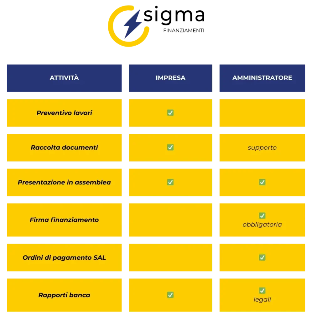 Il finanziamento viene infatti erogato su un conto intestato al condominio (art. 1129 c.c.), e solo l’amministratore può autorizzare i pagamenti verso l’impresa secondo gli stati avanzamento lavori (SAL).